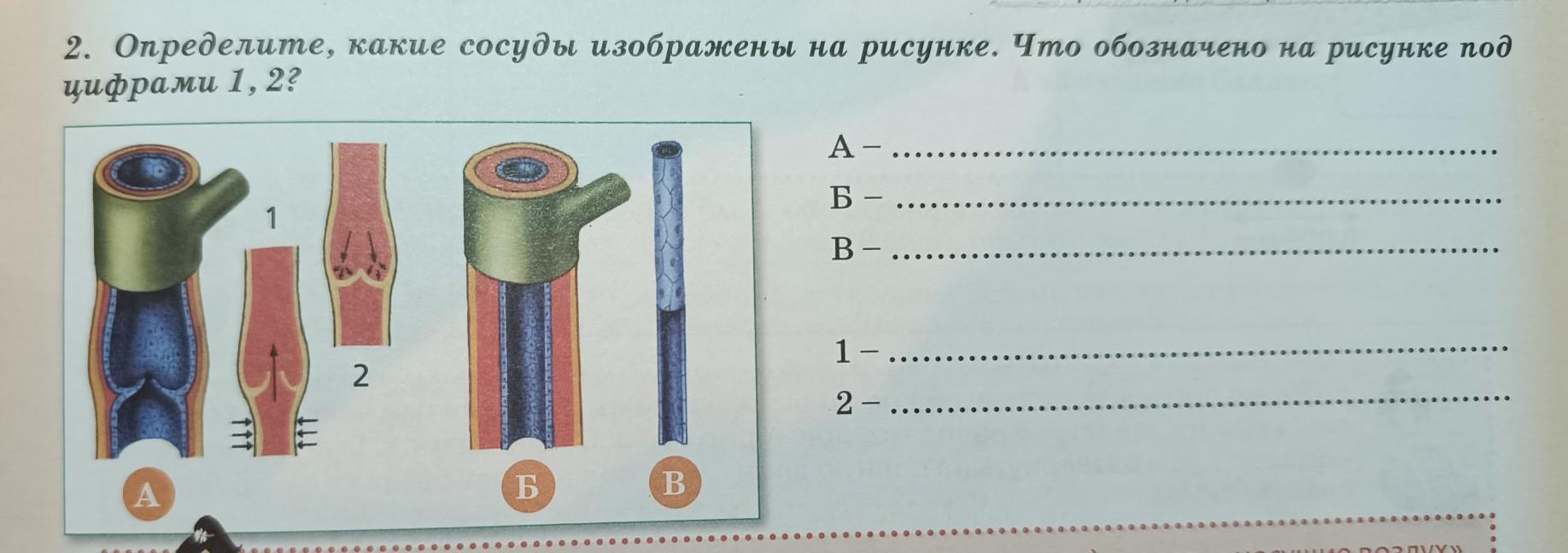 На рисунке А— вена, на Б— артерия, В— капилляр. Цифрой 1 обозначено движение крови вверх (в вене), и на 2— то, как карманные клапаны препятствуют стечению крови вниз (кровь венах течет только снизу вверх)