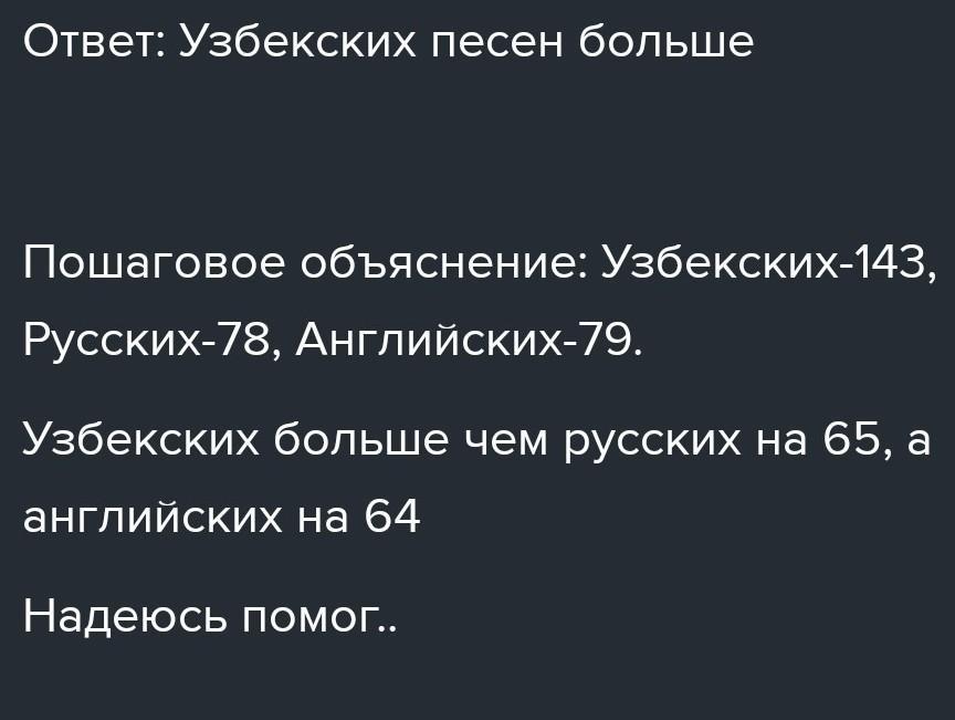 0. На диске записано 300 лучших песен этого года. 143 из них на узбекском языке, 78 – - на русском, остальные английском. Каких песен больше и на сколько?