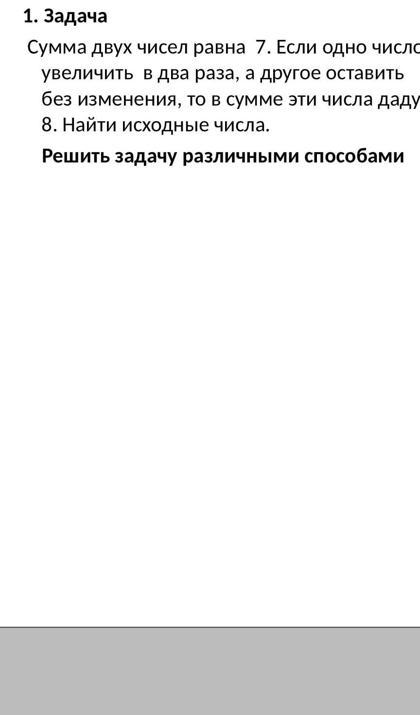 1. Задача Сумма двух чисел равна 7. Если одно число увеличить в два раза, а другое оставить без изменения, то в сумме эти числа дадут 8. Найти исходные числа. Решить задачу различными способами.Помогите
