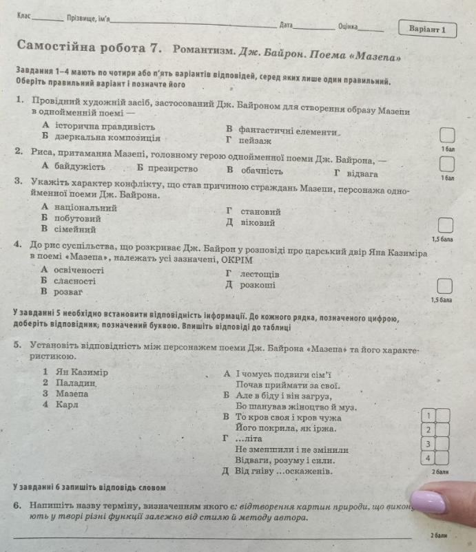 1. Провідний художній засіб, застосований Дж. Байроном для створення образу Мазепи в однойменній поемі: