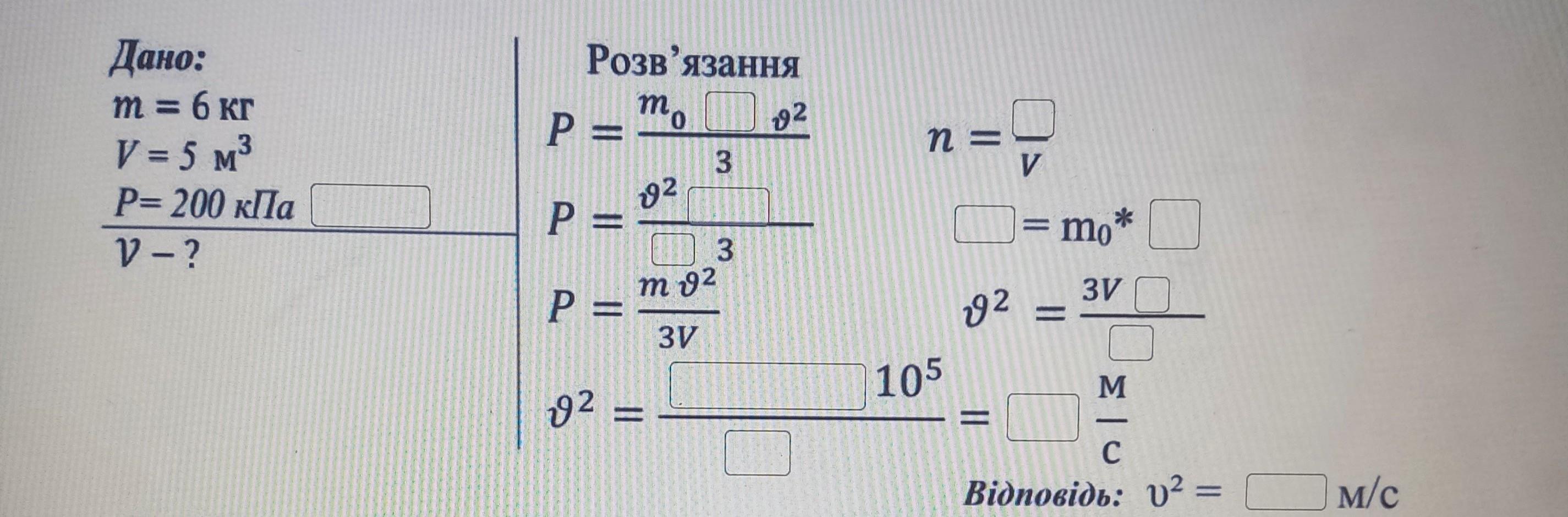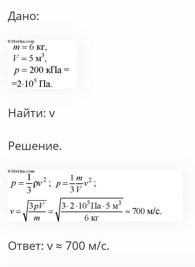 Чому дорівнює середня квадратична швидкість руху молекул газу, якщо, маючи масу 6 кг, він займає об'єм 5 м3 при тиску 200 кПа?
