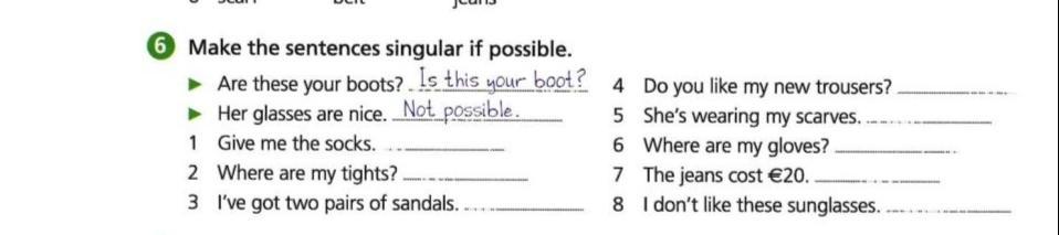 1 Give me that sock. 2 Not possible 3 I've got one pair of sandal. 4 Not possible 5 She's wearing my scarf. 6 Where is my glove? 7 Not possible 8 Not possible