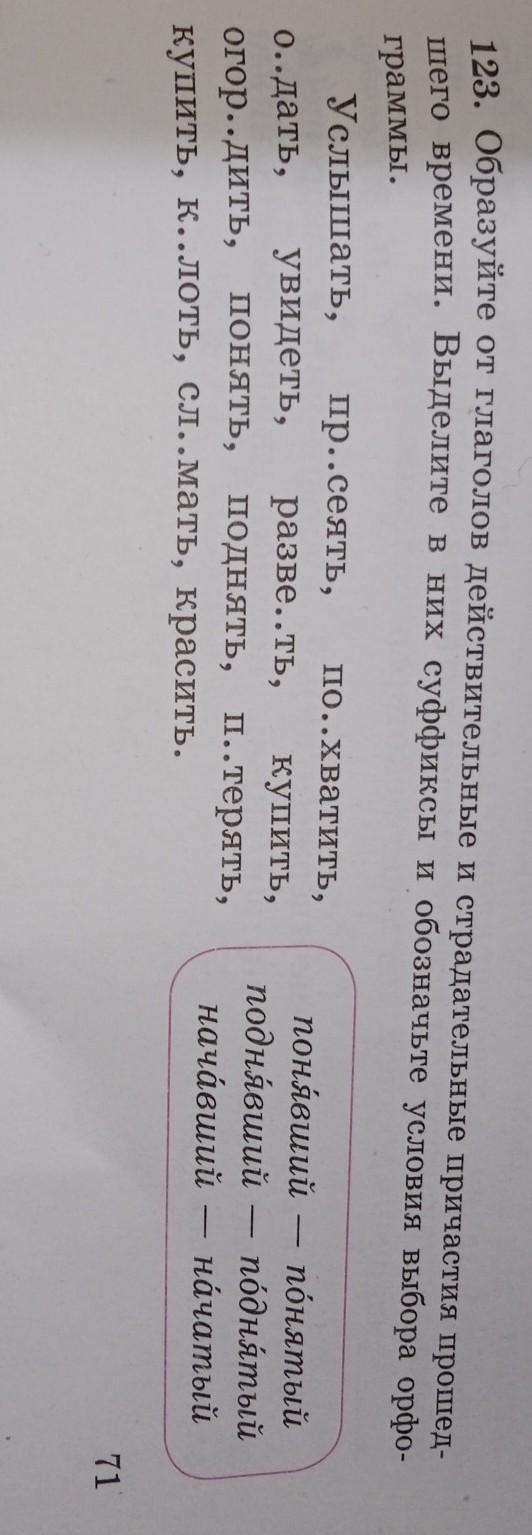123. Образуйте от глаголов действительные и страдательные причастия прошедшего времени. Выделите в них суффиксы и обозначьте условия выбора орфограммы. Услышать, по..хватить, о..дать, увидеть, разве..ть, купить, огор..дить, понять, поднять, п..терять, купить, к..лоть, сл..мать, красить. пр..сеять, понявший поднявший начавший понятый поднятый начатый