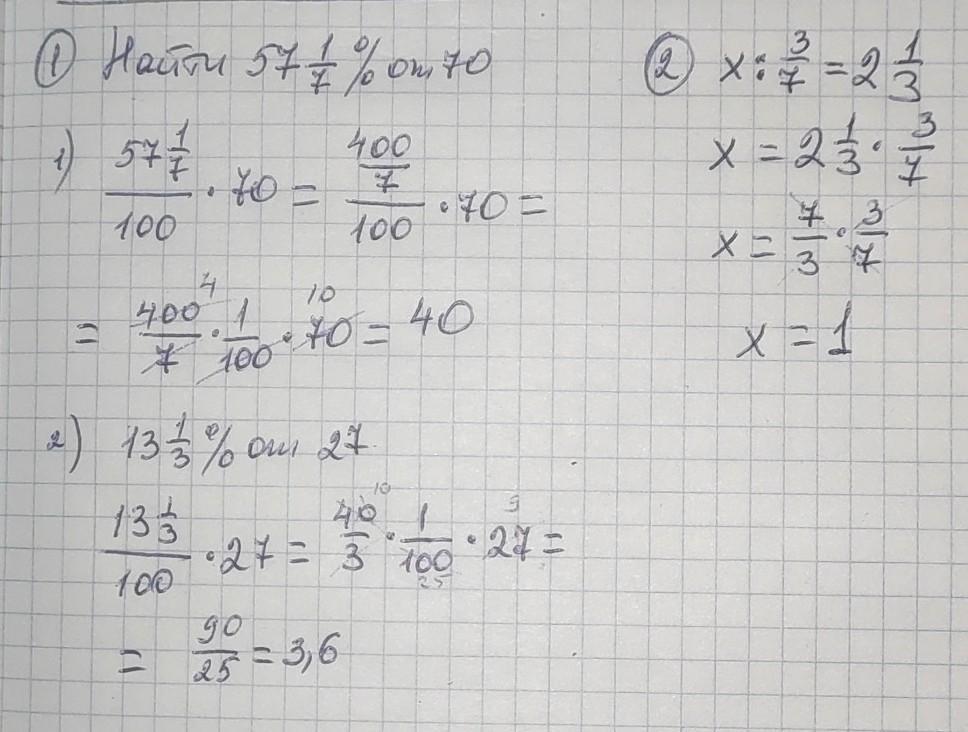 №1 Знайдіть: 1) 57 1/7 % від 70; 2) 13 1/3% від 27.