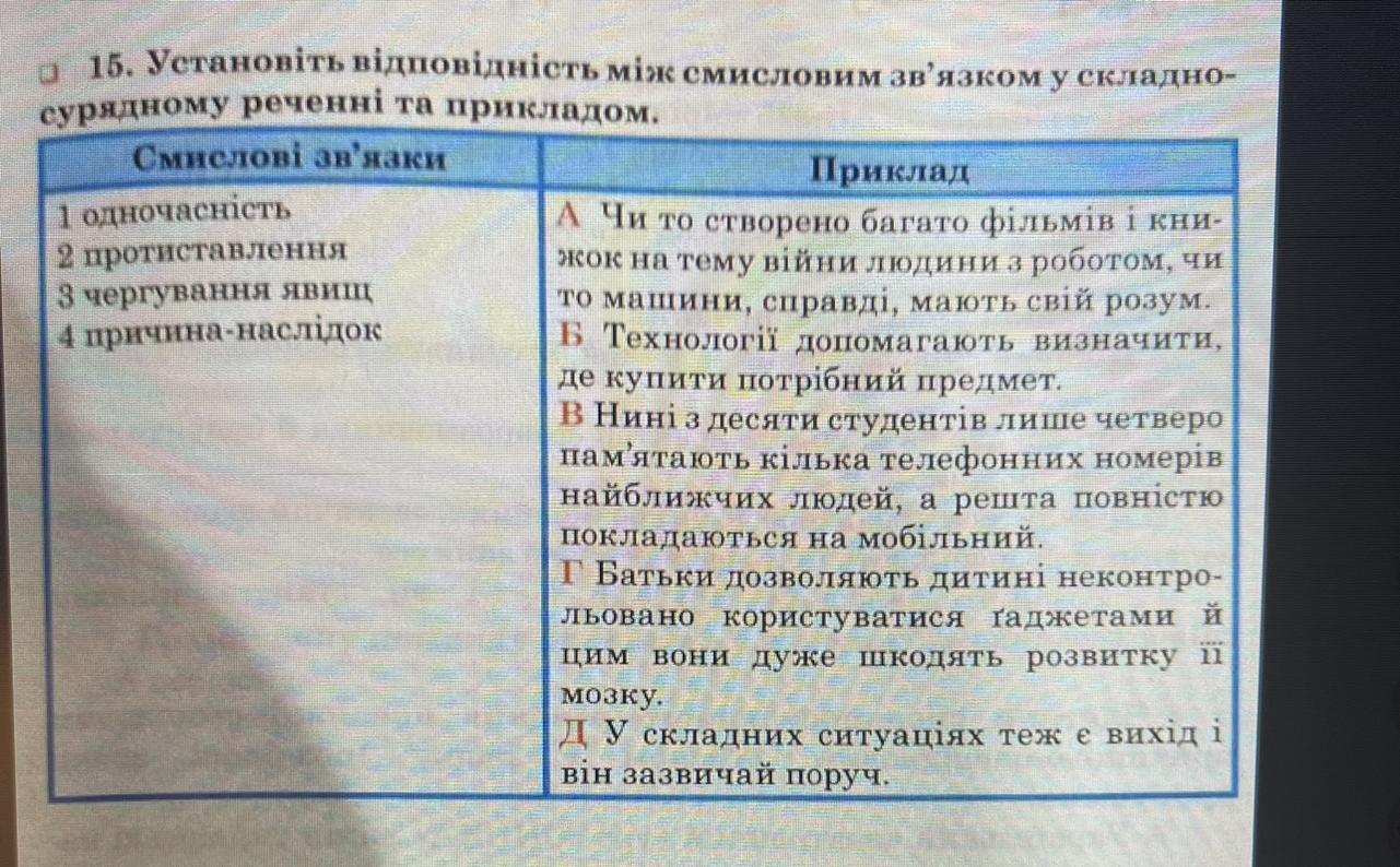 15. Установіть відповідність між смисловим звʼязком у складносурядному реченні та прикладом.