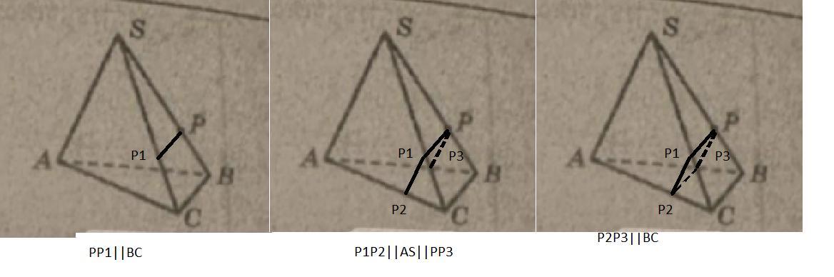 проходить через точку Р на ребрі SB і паралельна ВС і SA