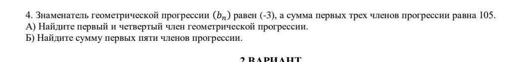 4. Знаменатель геометрической прогрессии (bn) равен (-3), а сумма первых трех членов прогрессии равна 105 A) Найдите первый и четвертый член геометрической прогрессии. Б) Найдите сумму первых пяти членов прогрессии. помогите пж