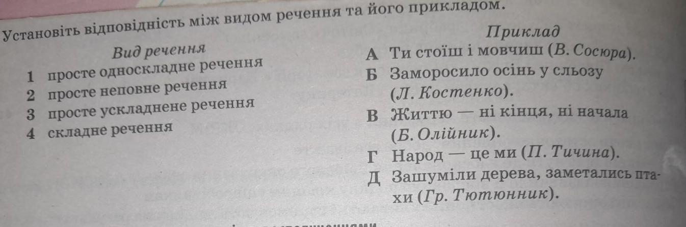 10. Установіть вiдповiднiсть між видом речення та його прикладом. Вид речення 1 просте односкладне речення 2 просте неповне речення 3 просте ускладнене речення 4 складне речення Приклад А Ти стоїш і мовчиш (В. Сосюра). Б Заморосило осінь у сльозу (Л. Костенко). в життю нi кiнця, ні начала (Б.Олійник). Г Народ це ми (П. Тичина). д Зашуміли дерева, заметались пта хи (Гр. Тютюнник).