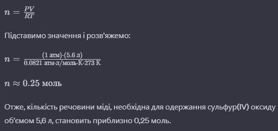 Тепер розглянемо обчислення кількості речовини міді. Відомо, що 5,6 л сульфур(IV) оксиду (SO2) становлять один молекулярний об'єм (STP). Ми можемо використовувати ідеальний газовий закон для обчислення кількості молекул: