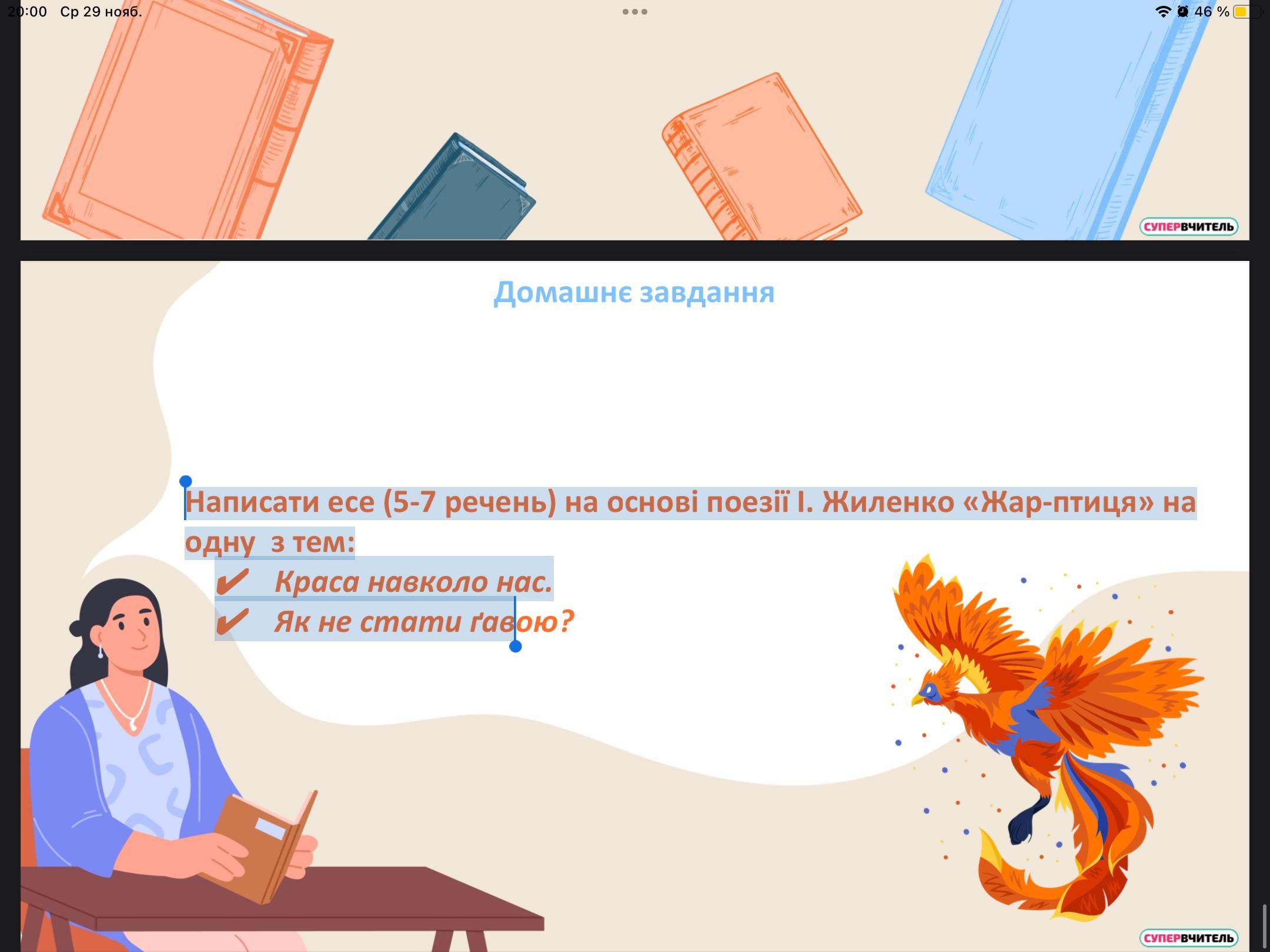 У вірші "Жар-птиця" Жиленко особливо прекрасно передає магію природи через образи квітів, птахів, неба та землі. Кожен рядок тут – це краплина нектару, що наповнює серце відчуттям величі та вродливості світу.