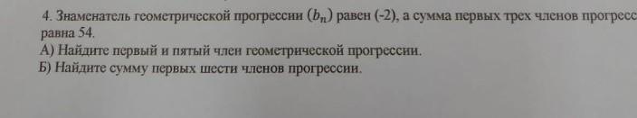4. Знаменатель геометрической прогрессии (ь) равен (-2), а сумма первых трех членов прогресс равна 54. А) Найдите первый и пятый член геометрической прогрессии. Б) Найдите сумму первых шести членов прогрессии.