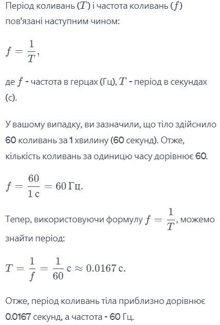 Під час коливань тіло здійснило 60 коливань за 1 хвилину. Визначте період і частоту коливань тіла.