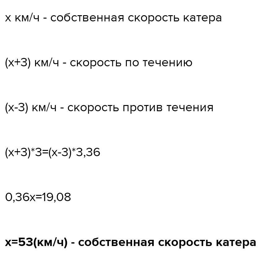 Катер прошёл по течению реки за 3 ч такое же расстоя- ние, какое он проходит за 3 ч 20 мин против течения. Скорость течения реки равна 2 км/ч. Найдите собст- венную скорость катера.