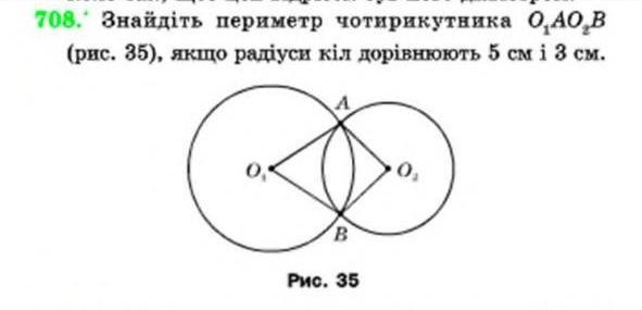 Знайдіть периметр чотирикутника О.А.В якщо радіуси кiл дорівнюють 5 см і 3 см.
