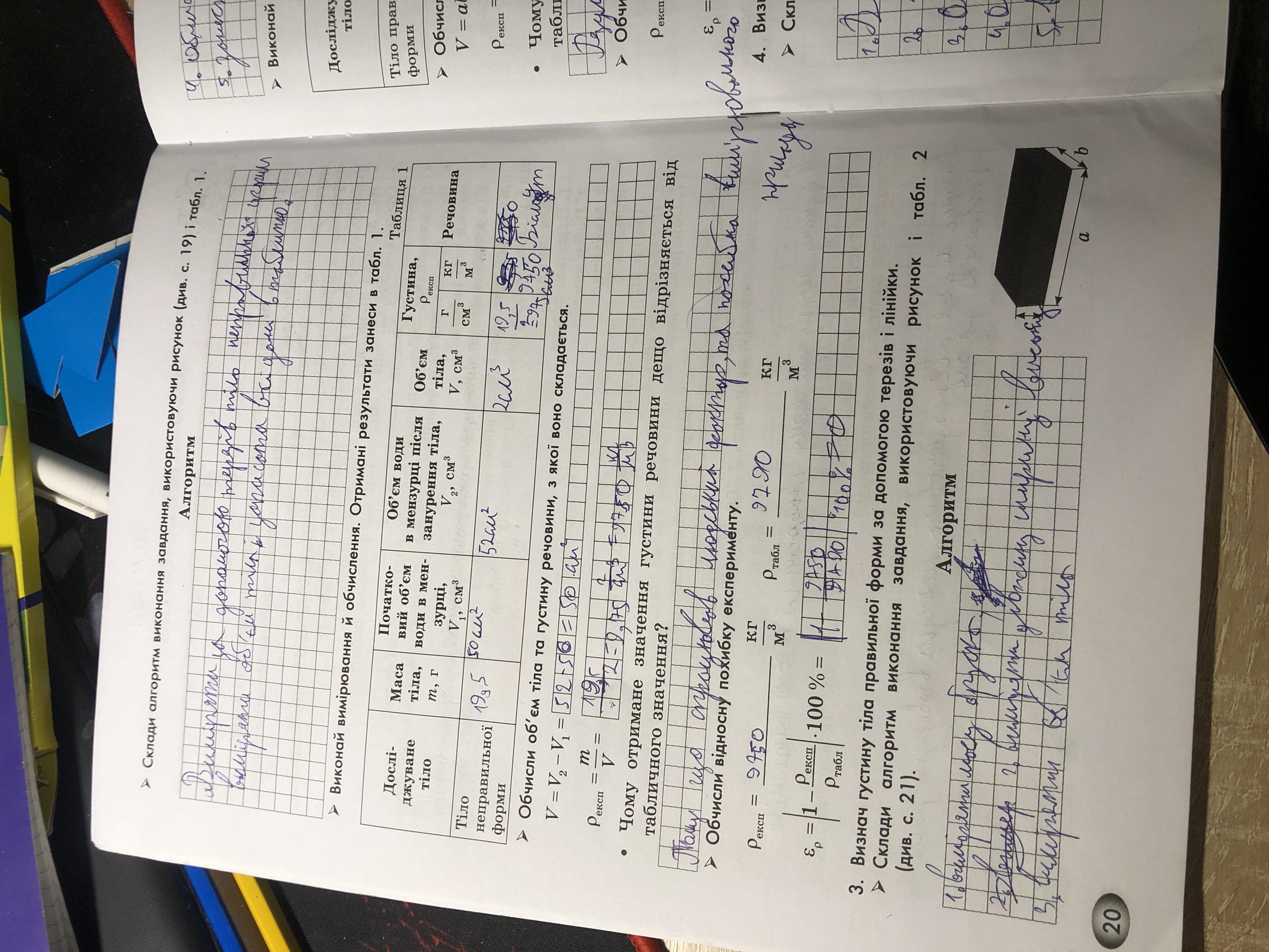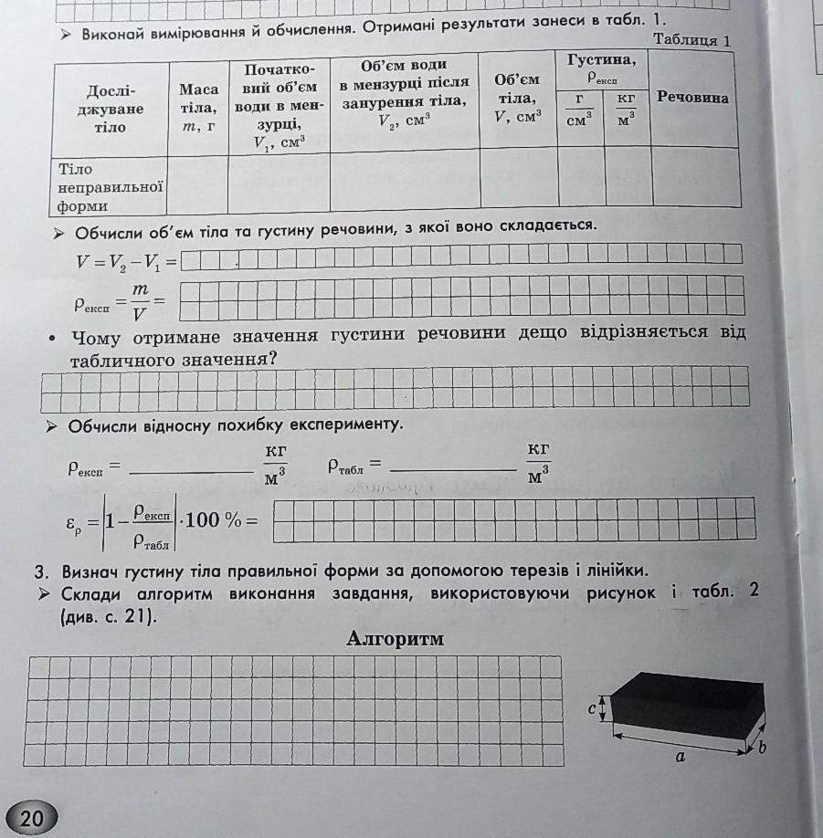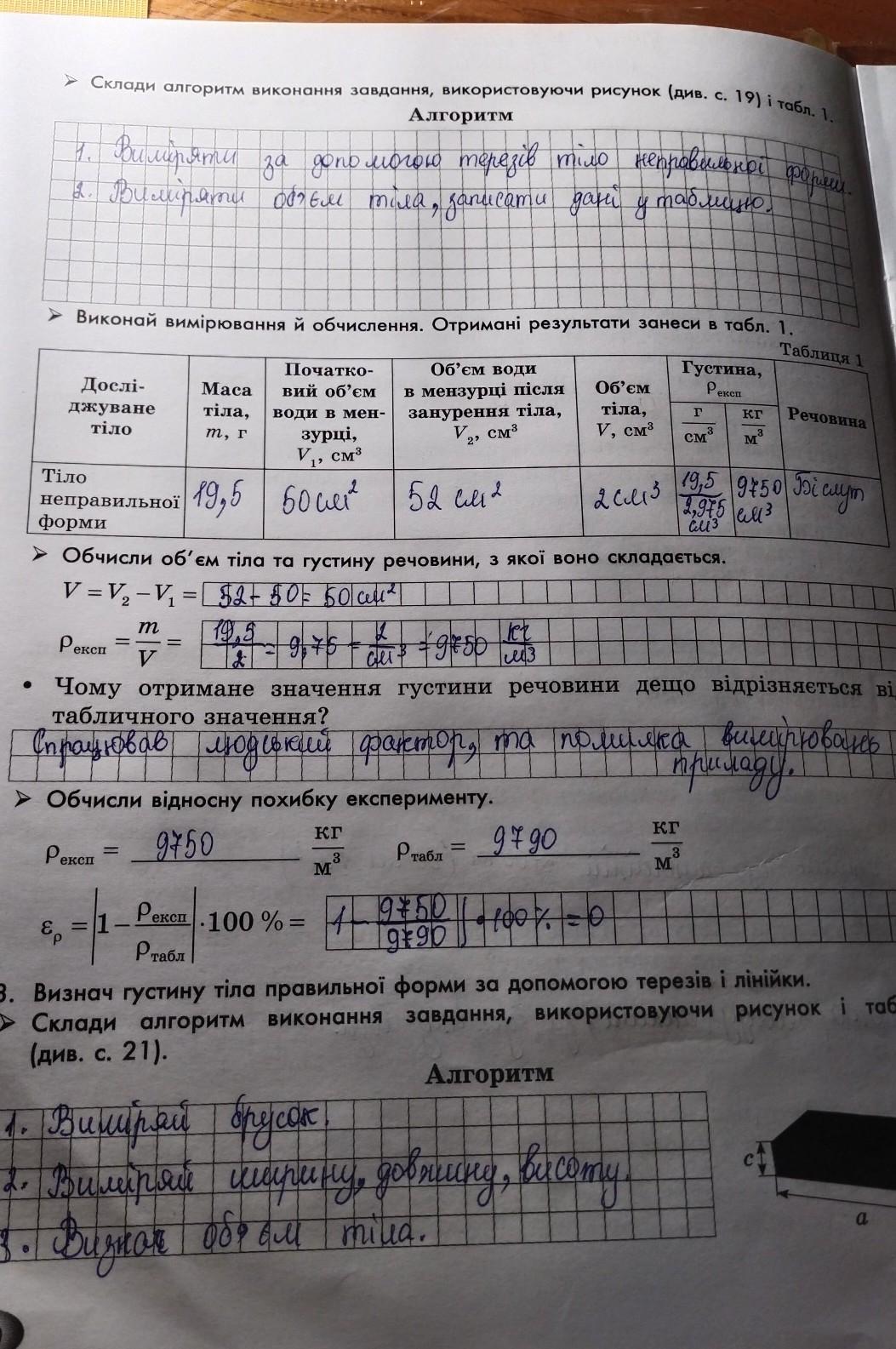 Виконай вимірювання й обчислення. Отримані результати занеси в табл. 1. Дослі- джуване тіло Тіло Ep = Початко- Maca вий об'єм води в мен- тіла, m, г зурцi, V,, см3 = 1- > Обчисли вiдносну похибку експерименту. КГ Рексп = Ртабл= 3 Об'єм води в мензурці після занурення тіла, V2, см³ Рексп -100%= Ртабл неправильної форми > Обчисли об'єм Tina та густину речовини, з якої воно складається. V=V -V1 = m Рексп V • Чому отримане значення густини речовини дещо відрізняється від табличного значення? M Об'єм тіла, V, см³ КГ 3 Густина, Рексд М' r см3 Таблиця 1 КГ Речовина 3 M 3. Визнач густину тіла правильноï форми за допомогою терезів і лінійки. > Склади алгоритм виконання завдання, використовуючи рисунок і табл. 2 (див. с. 21). Алгоритм a b