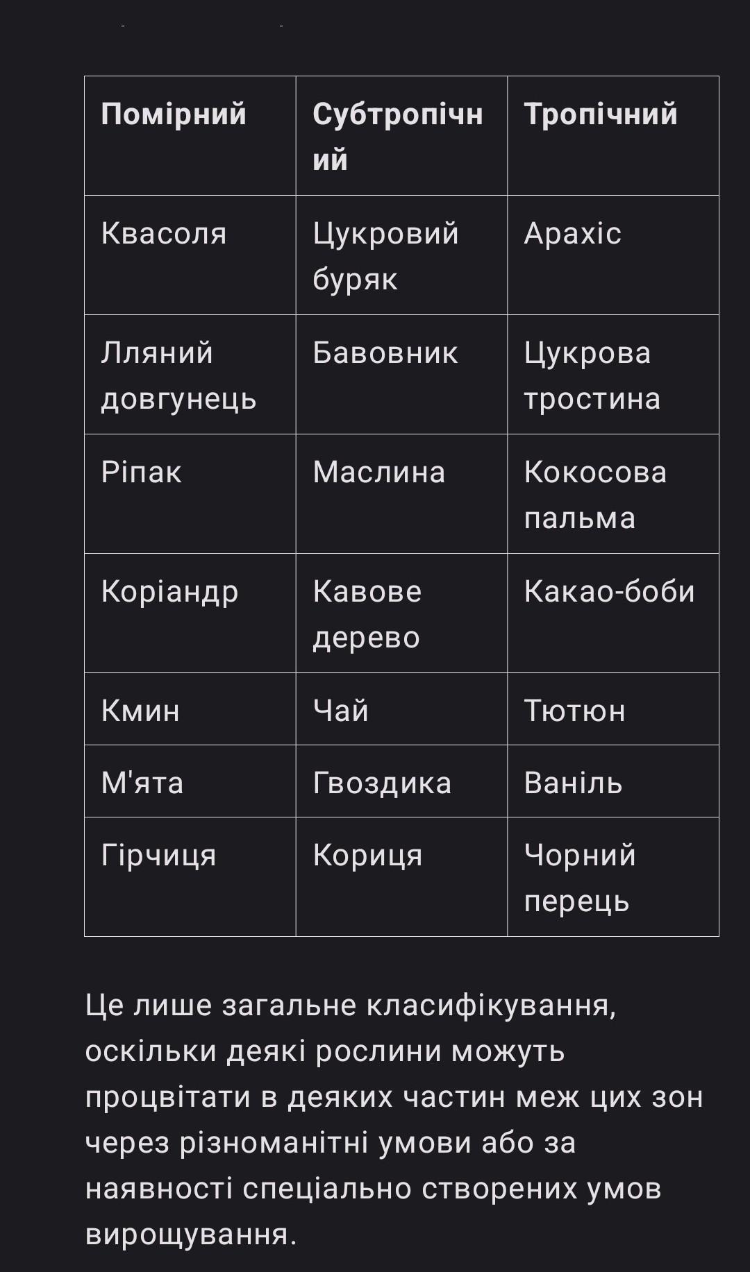Напиши кіматичний пояс цих рослин квасоля, нут, чина, вика, арахіс, цукровий буряк, цукрова тростина, бавовник, льон-довгунець, джут, агава, сизаль, соняшник, ріпак, маслина, олійна і кокосова пальми, корідіадр, кмин, аніс, м'ята, кавове дерево, чай, какао-боби, тютюн, ваніль, гвоздика, гірчиця, кориця, чорний перець. Розділи на 3 стовпчики перший стовпчик помірний другий субтропічний третій тропічний 50 балов