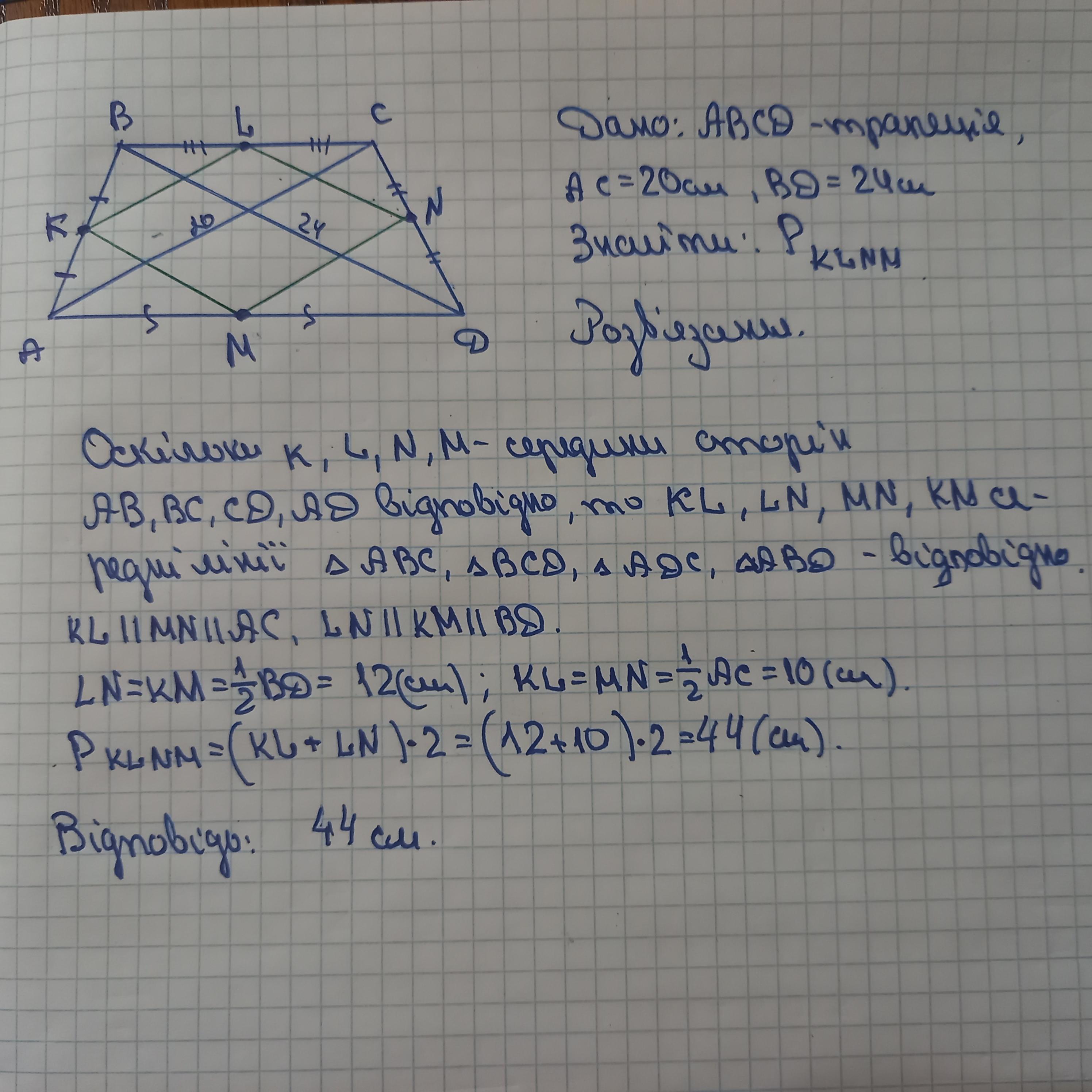 ДОПОМОЖІТЬ БУДЬ ЛАСКА Діагоналі трапеції дорівнюють 24 см і 20 см. Знайди периметр чотирикутника вершинами якого є середини сторiн даної трапеції. ДАЮ 59 БАЛІВ