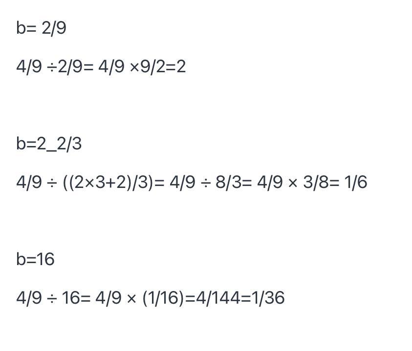 4/9 ÷ 16= 4/9 × (1/16)=4/144=1/36