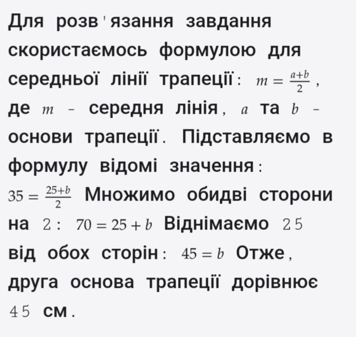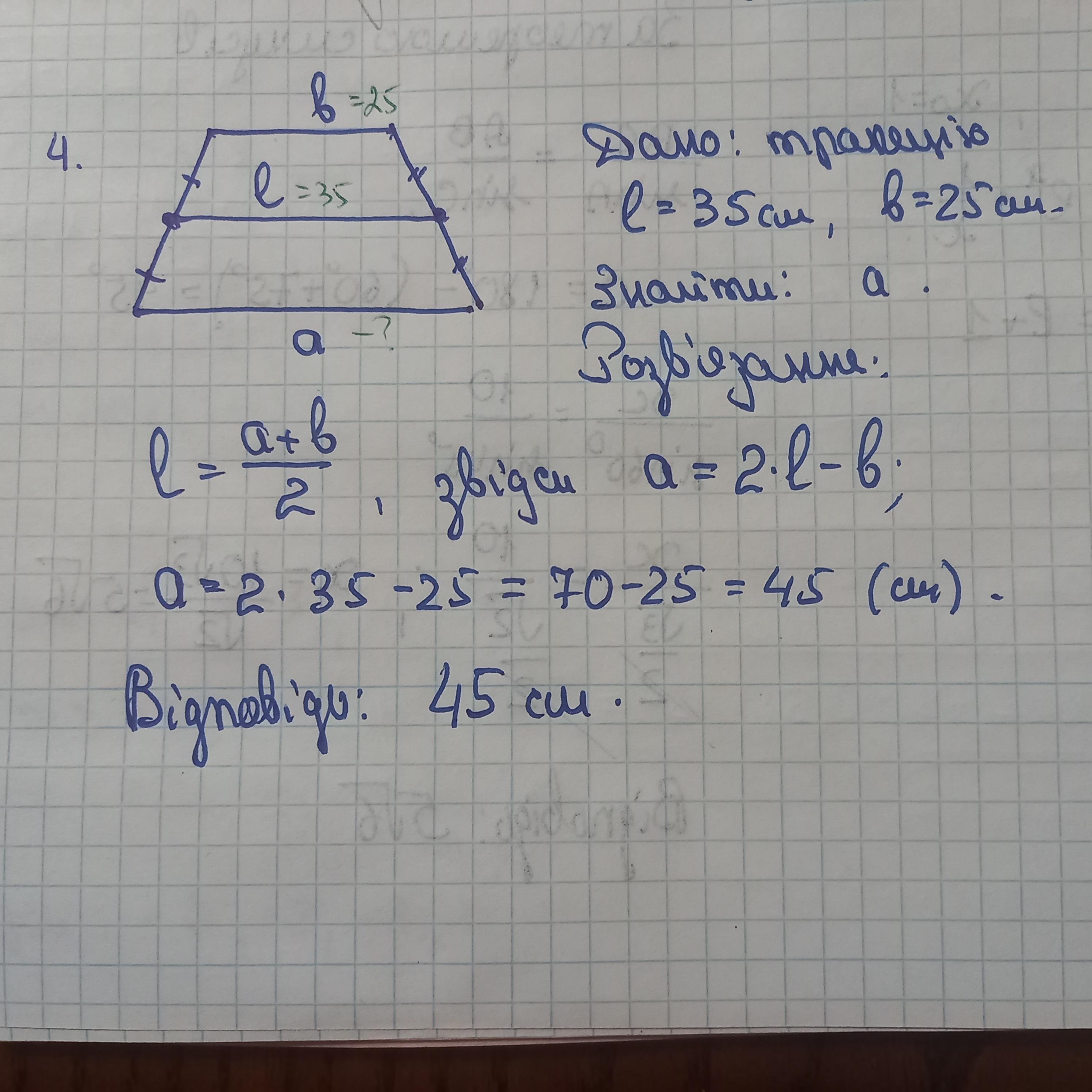 4. Середня лінія трапеції дорівнює 35 см, а одна з основ - 25 см. Знайдіть другу основу трапеції.