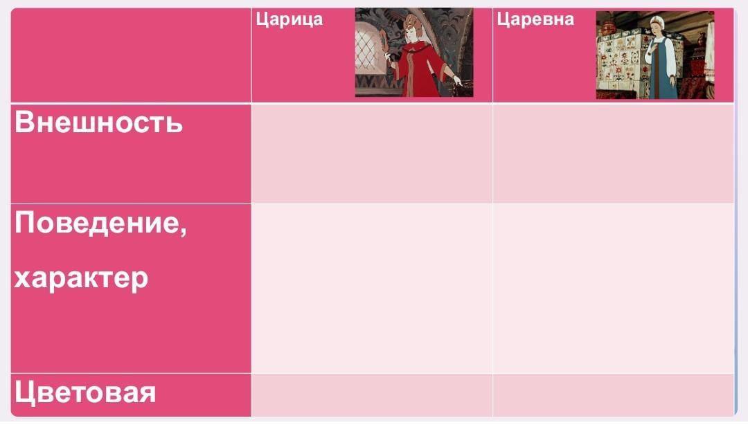 Составьте словесный портрет царицы(мачехи) и царевны, используя таблицу. В ответе обязательно используйте цитаты из "Сказки о мёртвой царевне..."