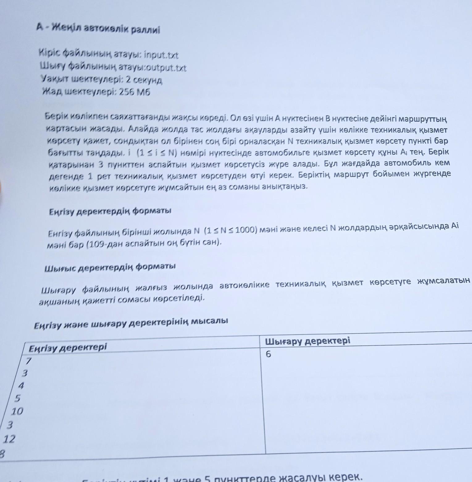 А - Жеңіл автокөлік раллиi Кiрiс файлының атауы: input.txt шығу файлының атауы:output.txt Уақыт шектеулерi: 2 секунд Жад шектеулерi: 256 Мб 8 Берік көлікпен саяхаттағанды жаксы кореді. Ол өзі үшін А нүктесінен В нүктесіне дейінгі маршруттын картасын жасады. Алайда жолда тас жолдағы ақауларды азайту үшiн көлiкке техникалык кызмет көрсету қажет, сондықтан ол бірінен соң бірі орналаскан N техникалык кызмет көрсету пункті бар бағытты таңдады. i (1 s is N) номiрi нүктесінде автомобильге қызмет көрсету куны А тең. Берік қатарынан 3 пункттен аспайтын қызмет көрсетусіз жүре алады. Бул жагдайда автомобиль кем дегенде 1 рет техникалық қызмет көрсетуден отуі керек. Берiктiң маршрут бойымен жургенде көлікке қызмет көрсетуге жұмсайтын ең аз соманы анықтаңыз. 3 Еңгізу және шығару деректерінің мысалы Еңгізу деректері 7 4 5 10 3 12 Еңгiзу деректердің форматы Енгізу файлының бірінші жолында N (1 5N 1000) мәні және келесі N жолдардын эркайсысында А мәні бар (109-дан аспайтын оң бүтін сан). Шығыс деректердің форматы Шығару файлынын жалғыз жолында автоколікке техникалық қызмет көрсетуге жұмсалатын ақшаның қажетті сомасы көрсетіледі. Шығару деректері 6 Түсініктемелер. Беріктің күтімі 1 және 5 пункттерде жасалуы керек.