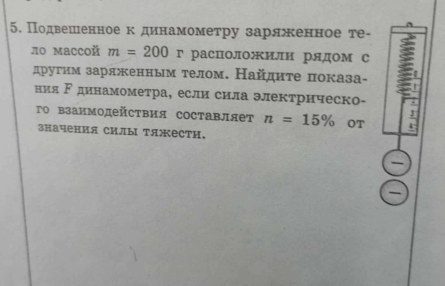 5. Подвешенное к динамометру заряженное те- ло массой м = 200 г расположили рядом с другим заряженным телом. Найдите показа- ния F динамометра, если сила электрическо- го взаимодействия составляет п = 15% от значения силы тяжести.