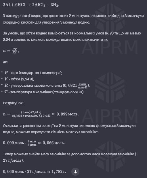 ДОПОМОЖІТЬ ❗️Яка маса алюмінію вступить у реакцію з хлоридною кислотою, якщо при цьому виділиться 2,24 л водню за н. у.?