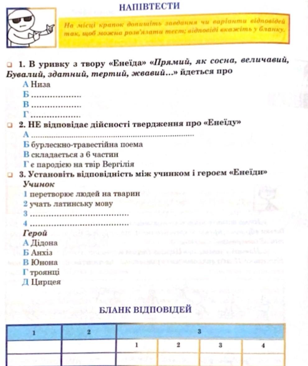 НАПІВТЕСТИ На місці крапок допишіть завдання чи варіанти відповідей так, щоб можна розв'язати тест; відповіді вкажіть у бланку. 0 1. В уривку з твору «Енеїда» «Прямий, як сосна, величавий, Бувалий, здатний, тертий, жвавий...» йдеться про А Низа Б B r о 2. НЕ відповідає дійсності твердження про «Енеїду» A Б бурлескно-травестійна поема В складається з 6 частин Г'е пародією на твір Вергілія 3. Установіть відповідність між учинком і героем «Енеїди» Учинок S 1 перетворюе людей на тварин 2 учать латинську мову 3 4 *************** Герой А Дідона Б Анхiз В Юнона Г троянці Д Цирцея ******** 2 БЛАНК ВІДПОВІДЕЙ 2 3 3