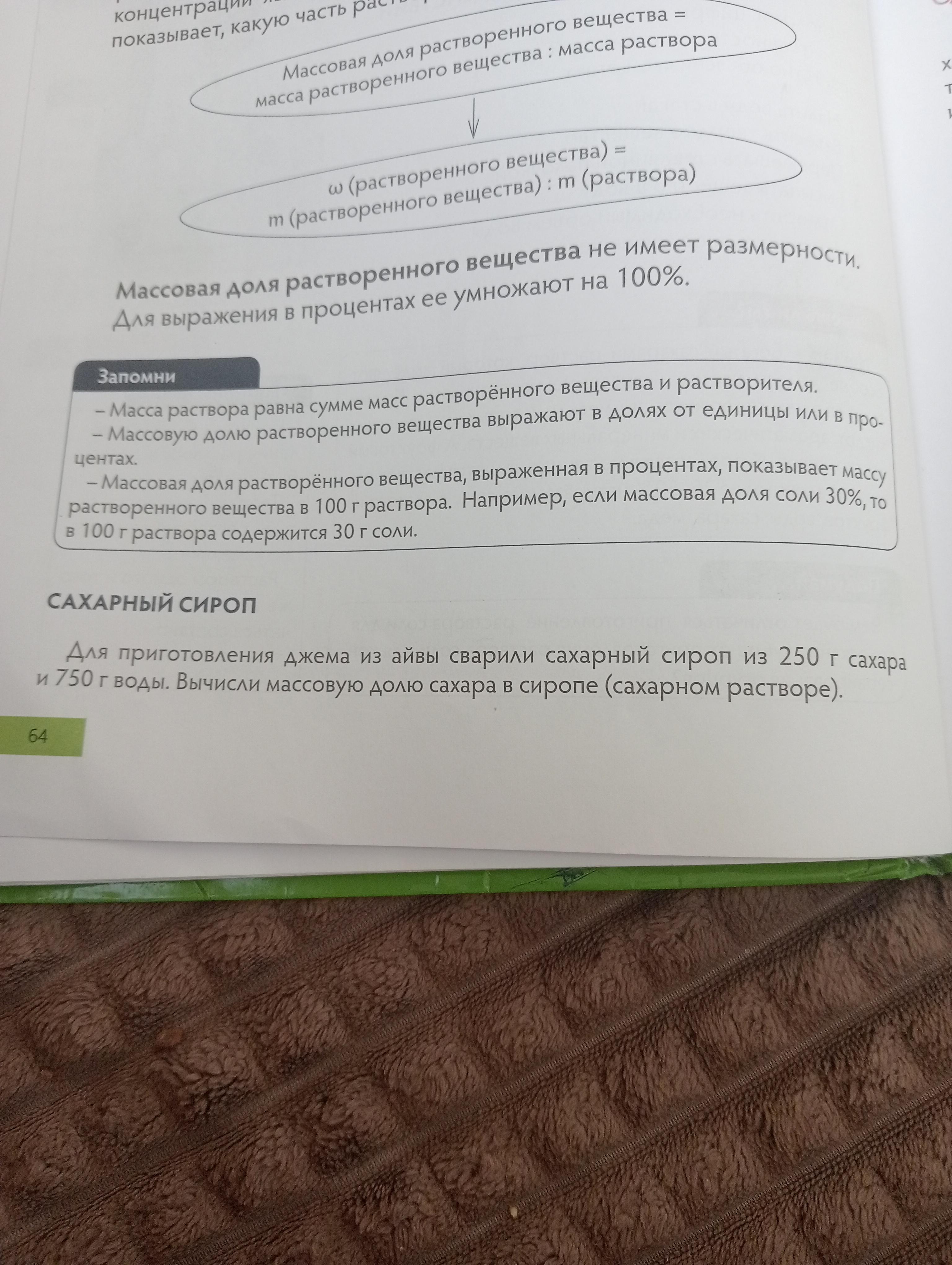 Для приготовления джем из айвы сварили сахарный сироп из 250 г сахара и 750 г воды. Вычисли массовую долю сахара в сиропе (сахарном сиропе)