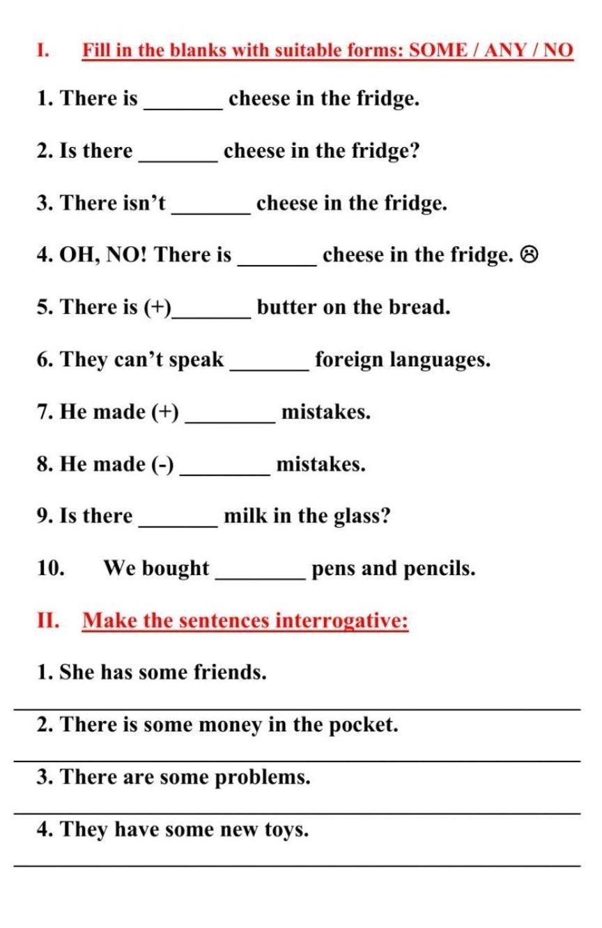 I. Fill in the blanks with suitable forms: SOME/ANY/NO 1. There is 2. Is there 3. There isn't 4. OH, NO! There is 5. There is (+)_ 6. They can't speak 7. He made (+) 8. He made (-) 9. Is there cheese in the fridge. cheese in the fridge? 10. cheese in the fridge. cheese in the fridge. butter on the bread. foreign languages. mistakes. mistakes. milk in the glass? We bought II. Make the sentences interrogative: 1. She has some friends. 2. There is some money in the pocket. 3. There are some problems. 4. They have some new toys. pens and pencils.
