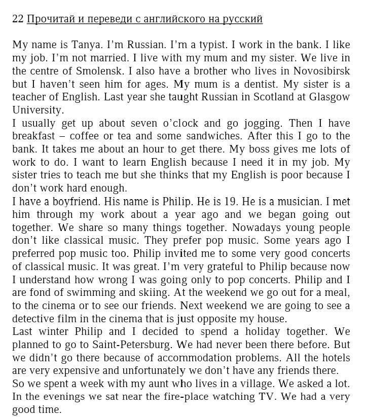 Меня зовут Таня. Я русская. Я клавишник. Я работаю в банке. Мне нравится моя работа. Я не замужем. Живу с мамой и сестрой. Мы живем в центре Смоленска. У меня также есть брат, который живет в Новосибирске, но я не видела его уже давно. Моя мама — стоматолог. Сестра преподает английский. В прошлом году она преподавала русский в Шотландии в университете Глазго.