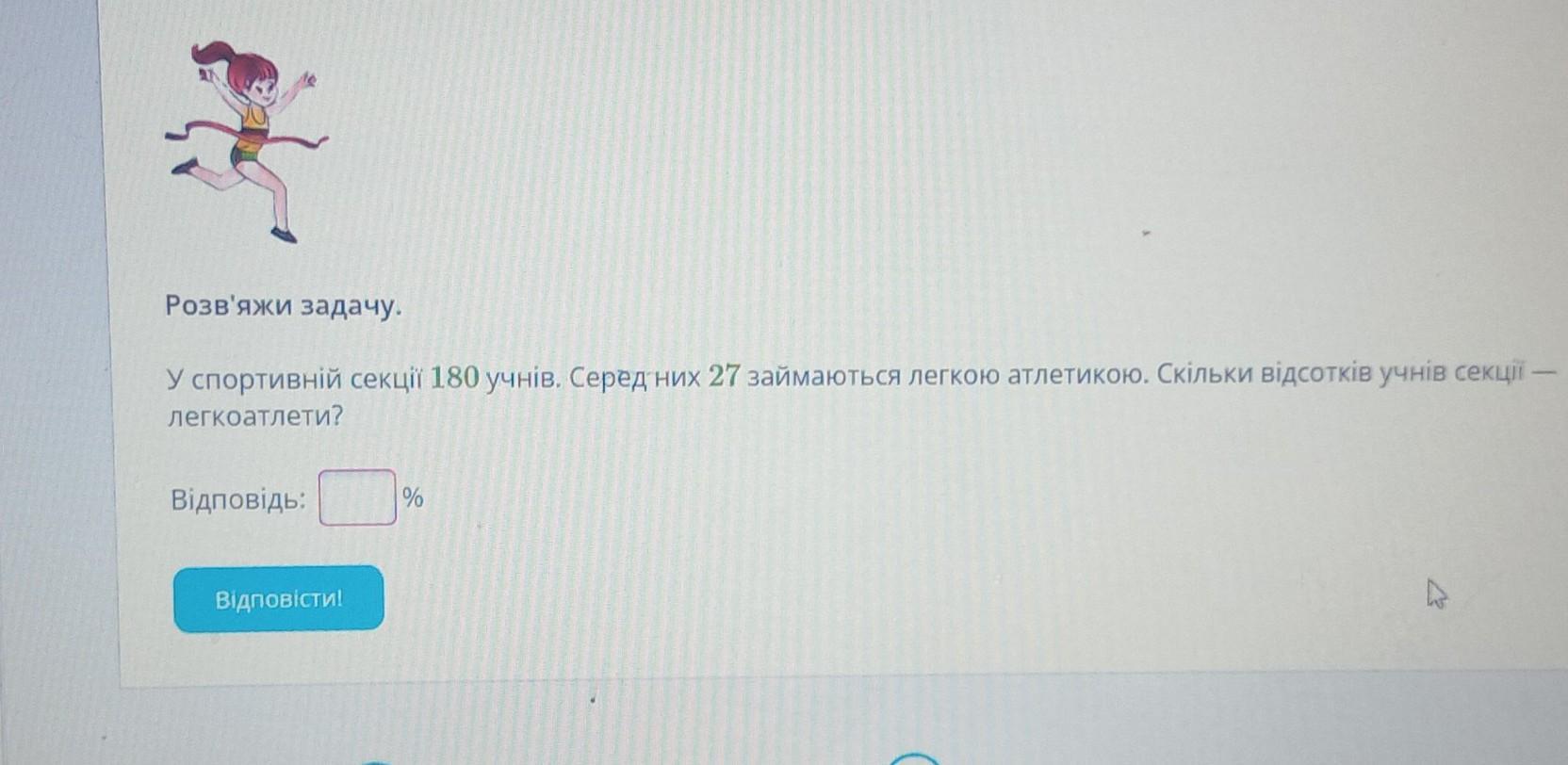 У спортивній секції 180 учнів. Серед них 27 займаються легкою атлетикою. Скільки відсотків учнів секції- легкоатлети?