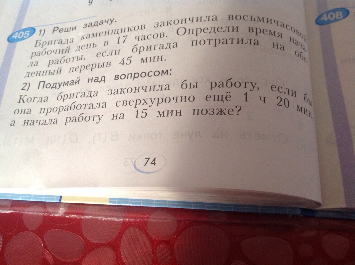 405) бригада каменщиков закончила восьмичасовой рабочий день в 17 часов Определи время начала работы если бригада потратила на обеденный перерыв 45 минут. когда бригада закончила бы работу, если бы она проработала сверхурочно еще 1ч 20 мин, а начала работу на 15 мин позже?