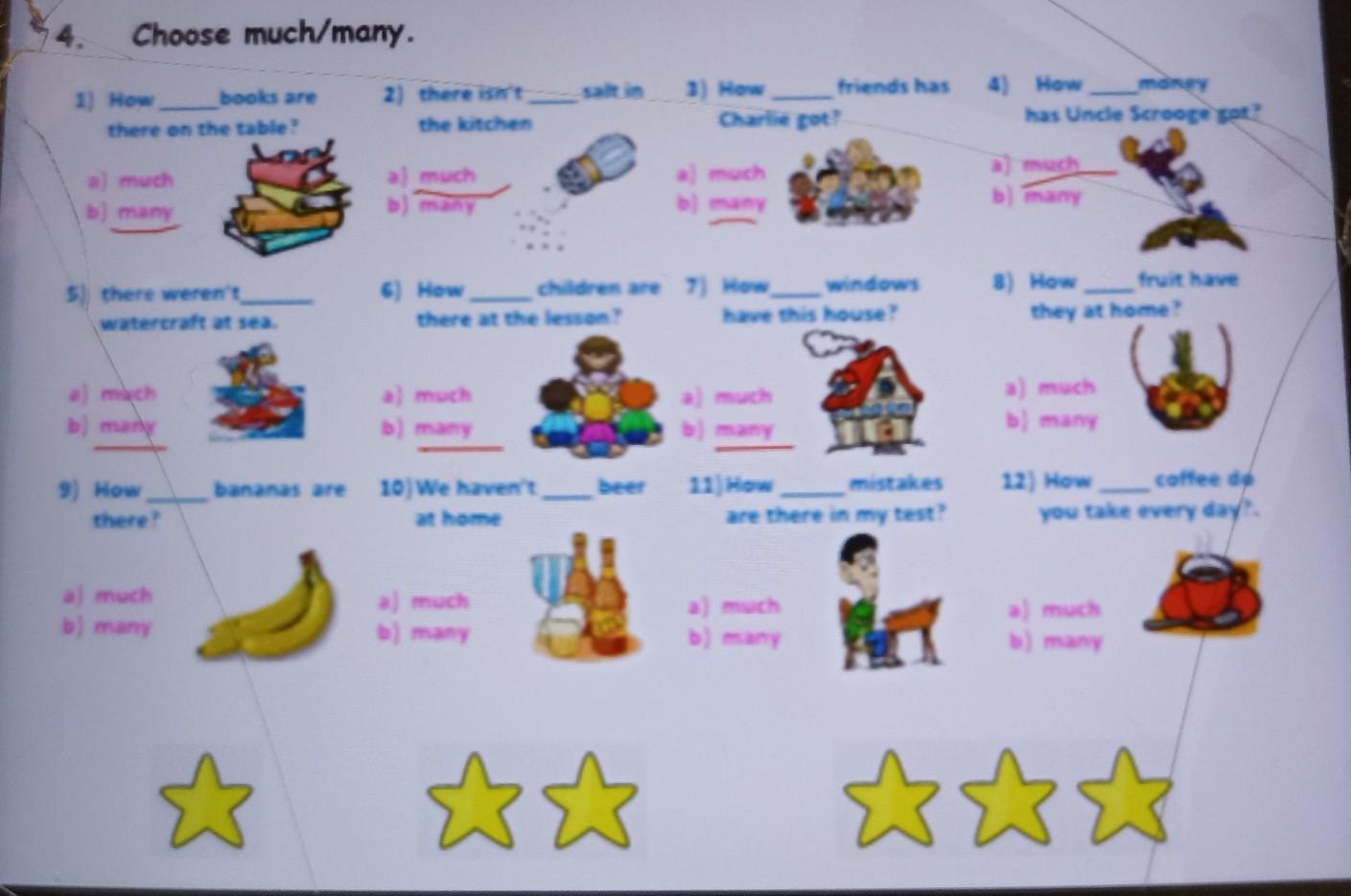 1) Now there on the table? 5) there weren' 9) How there? many 2) there isn't the kitchen 6) How salt in 3) How there at the lesson? b) many bananas are 10) We haven't at home much b) many children are 7) How Charlie got? a) much friends has 4) How money has Uncle Scrooge got? b) many beer 11) How have this house? windows a) much b) many mistakes are there in my test? many 8) How they at home? a) much b) many 12) How_ coffee do you take every day?. a) much b) many
