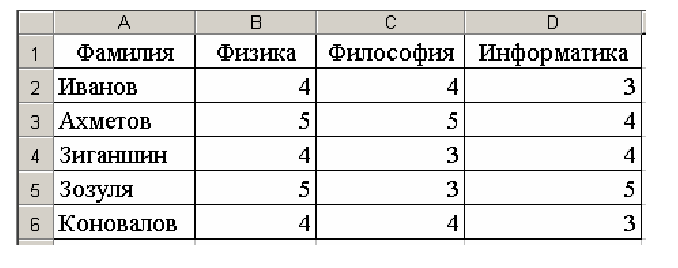 5) в ячейкуE2 вписать формулу ЕСЛИ(И(И(B2>3; C2>3); D2>3); 1;0);