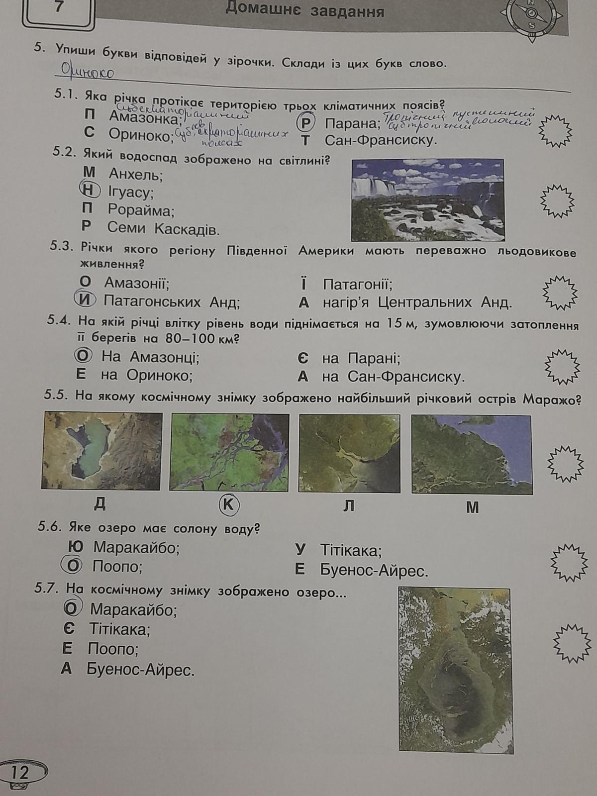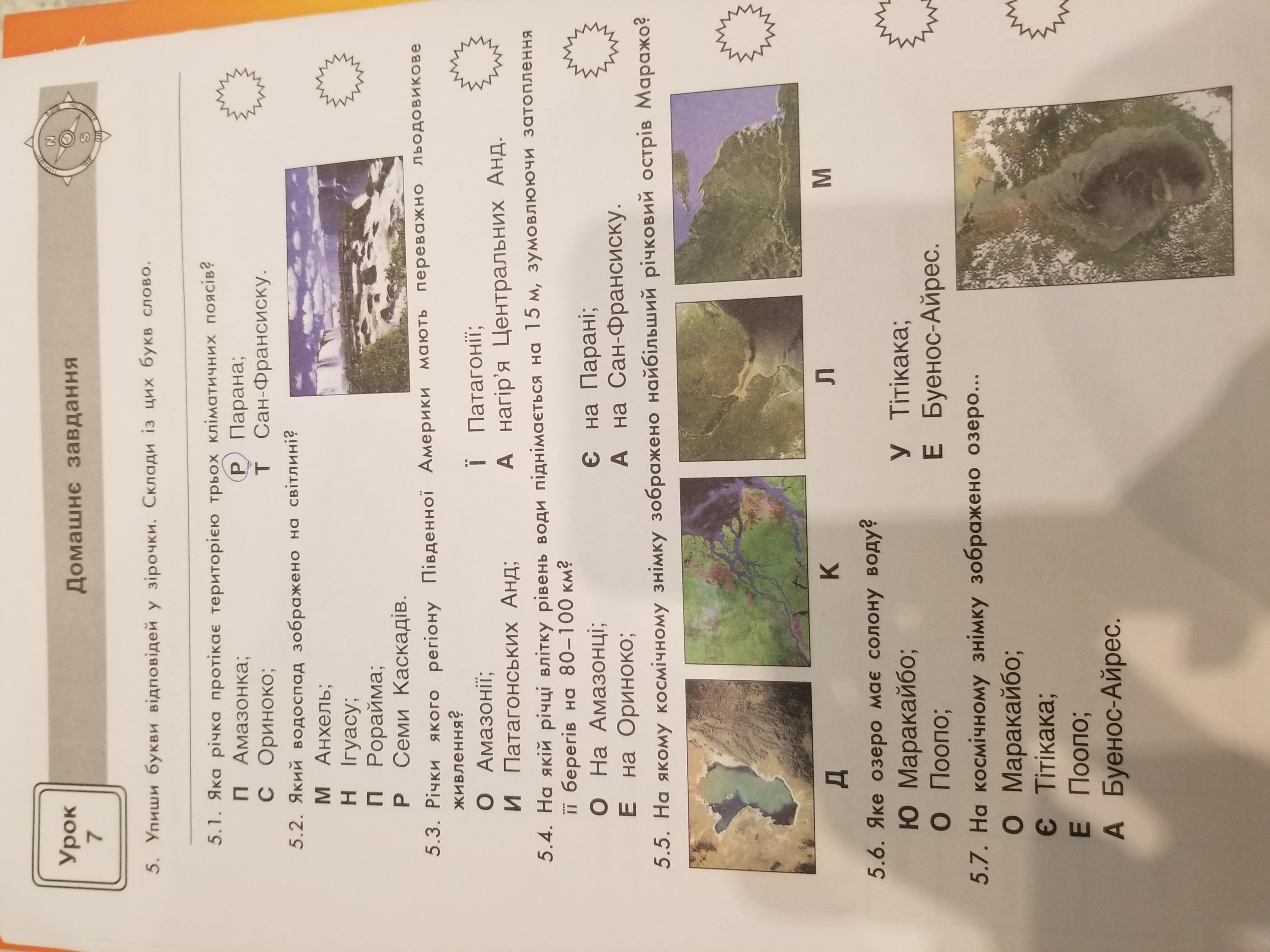Упиши букви відповідей у зірочки. Склади із цих букв слово. 5.1. Яка річка протікає територією трьох кліматичних поясів? П Амазонка; Р Парана; С Ориноко; Т Сан-Франсиску. 5.2. Який водоспад зображено на світлині? М Анхель; Н Ігуасу; П Рорайма; Р Семи Каскадів. 5.3. Річки якого регіону Південної Америки мають переважно льодовикове живлення? 0 Амазонії; ї Патагонії; И Патагонських Анд; А нагірʼя Центральних Анд. 5.4. На якій річці влітку рівень води піднімається на 15 м, зумовлюючи затоплення її берегів на 80-100 км? 0 На Амазонці; Є на Парані; Е на Ориноко; А на Сан-Франсиску. 5.5. На якому космічному знімку зображено найбільший річковий острів Маражо? д 5.6. Яке озеро має солону воду? Ю Маракайбо; • Поопо; 5.7. На космічному знімку зображено озеро... • Маракайбо; € Тітікака; Е Поопо; А Буенос-Айрес.