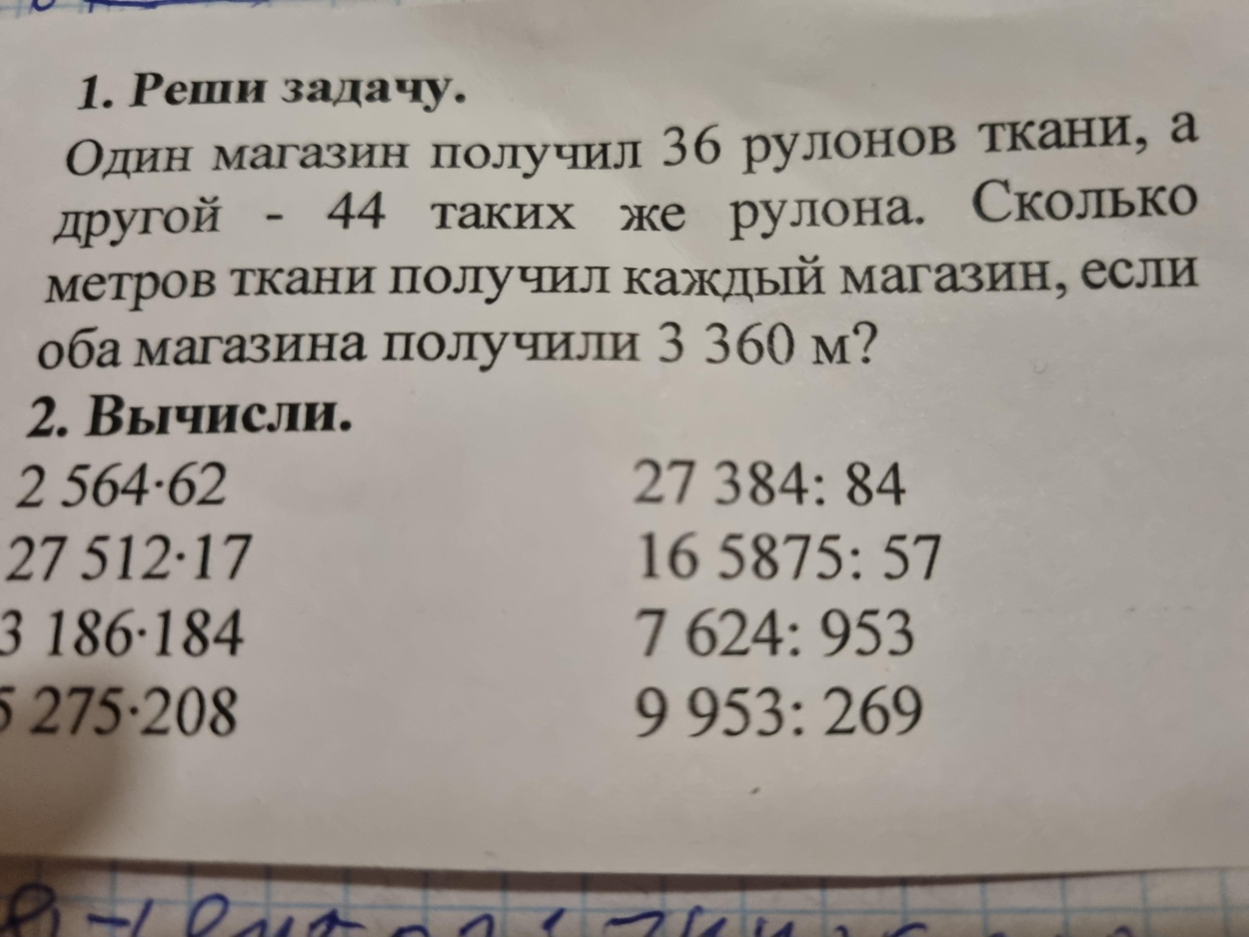 Один магазин получил 36 рулонов ткани а другой 44 таких же рулона сколько метров ткани получил каждый магазин если оба магазина получили 3360 м? Помогите срочно примеры я сам решу это очень срочно поэтому даю 40 баллов