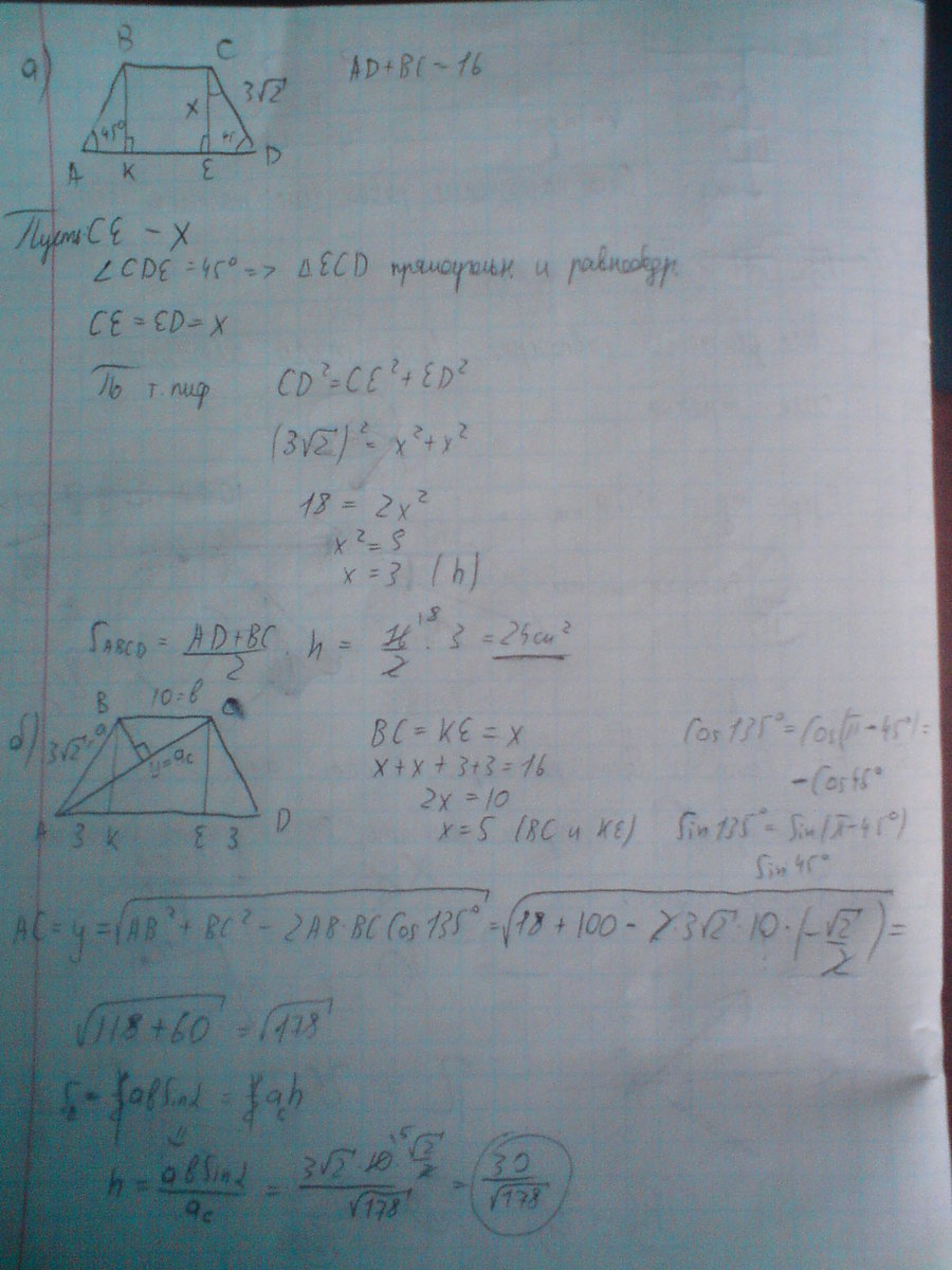 сумма оснований АD и ВС равнобокой трапеции равна 16 см, её боковая сторона 3 корня из 2 см, острый угол А равен 45 градусов. найти а)Sавсd б)расстояние от В до АС
