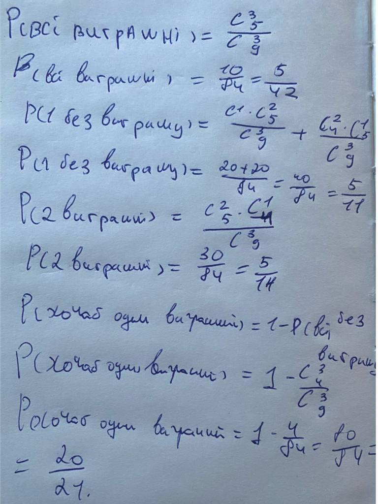 2. В темній скриньці 5 виграшних квитків та 4 квитки без виграшу. Випадково витягують 3 квитки. Знайти ймовірність того, що: