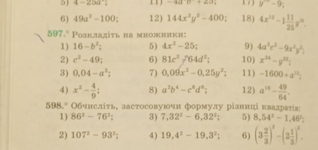 1. 16 - b^2 = (4 - b)(4 + b); 2) c^2 - 49 = (c - 7)(c + 7); 3) 0,04 - a^2 = (-a - 0.2)(a - 0.2); 4) x^2 - 4/9 = (x - 2/3)(x + 2/3); 5) 4x^2 - 25 = (2x - 5)(2x + 5); 6) 81c^2 - 64d^2 = (9c - 8d)(9c + 8d); 7) 0,09x^2 - 0,25y^2 = -0.12(0.3x - 0.5y)(0.3x + 0.5y); 8) a^2b^4 - c^6d^8 = (ab^2 - cd^4)(ab^2 + cd^4); 9) 4a^2c^2 -9x^2y^2 =(2ac - 3xy)(2ac + 3xy); 10) x^12 - y^11 = (x^6 - y^5)(x^6 + y^5); 11) - 1600 + a^6 = -(40 - a^3)(40 + a^3); 12) a^9 - 49/64 = (a^3 - 7/8)(a^3 + 7/8).