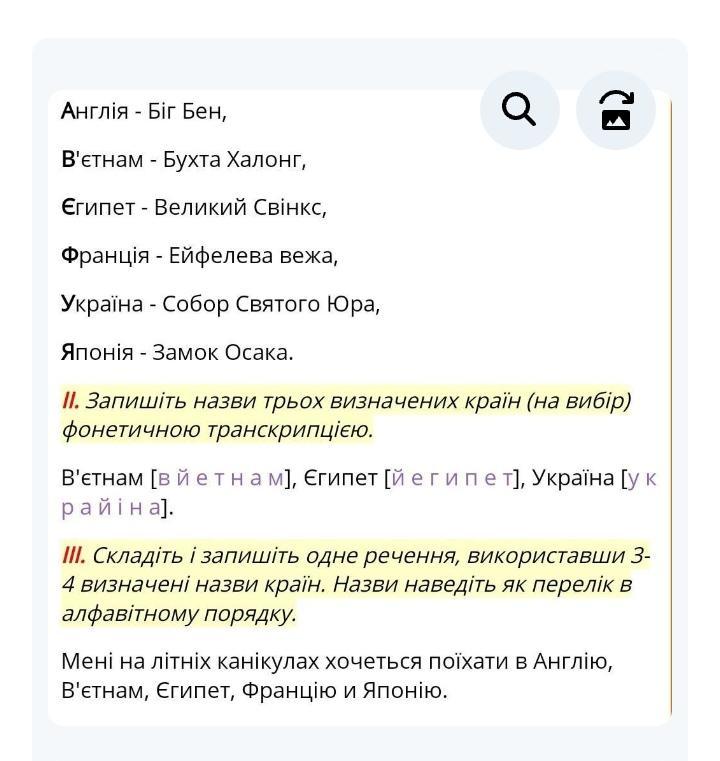 ІІІ. Складіть і запишіть одне речення, використавши 3–4 визначені назви країн. Назви наведіть як перелік в алфавітному порядку.