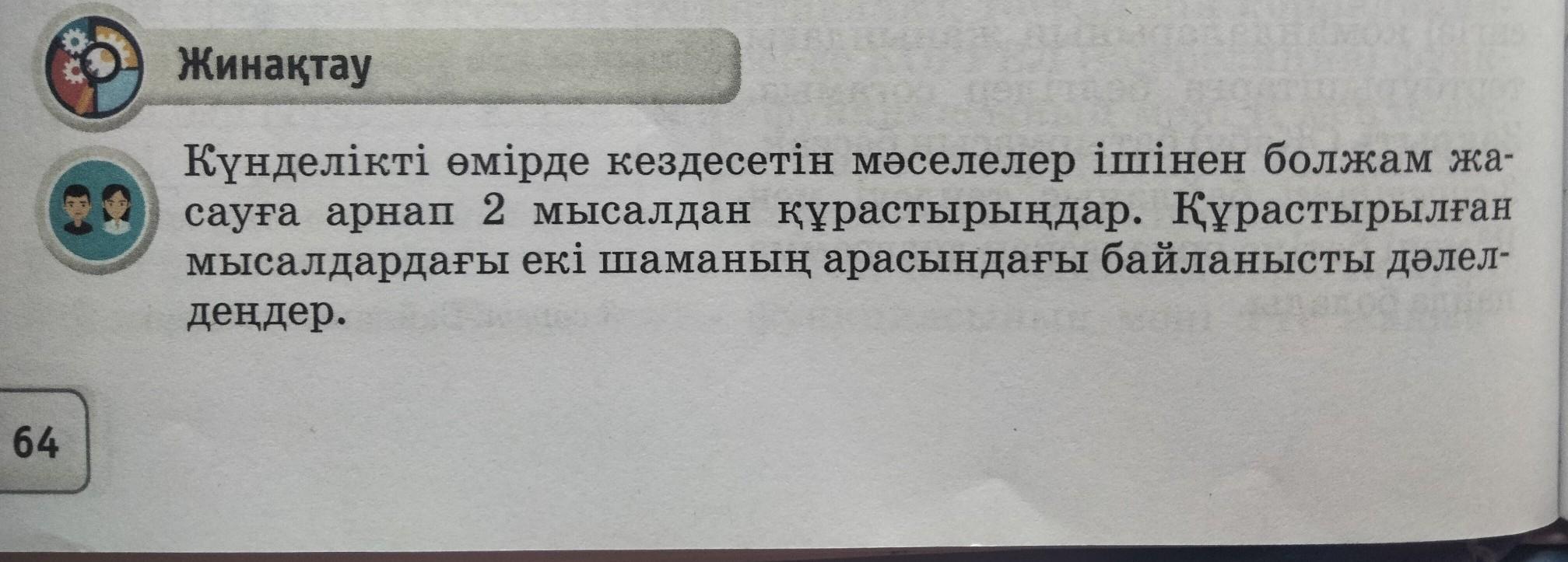 күнделікті өмірде кездесетін мәселелер ішінен болжам жасауға арнап 2мысалдан құрастырыңдар.құрастырылған мысалдардағы екі шаманың арасындағы байланысты дәлелдендер