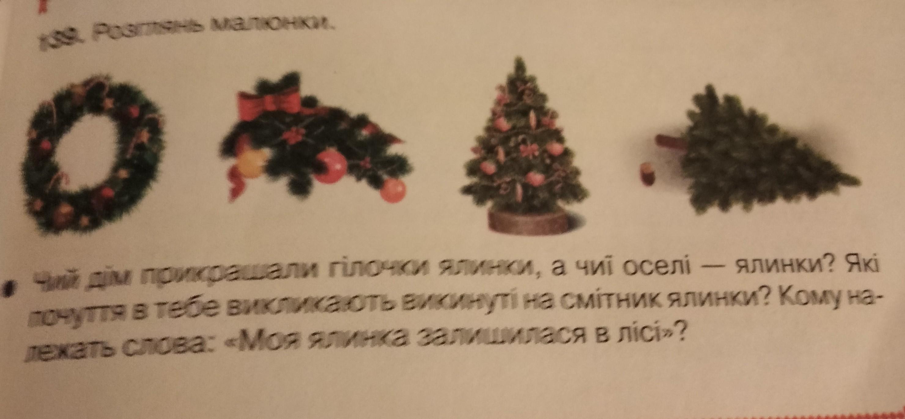 Розглянь малюнки. Чий дім прикрашали гілочки ялинки, а чиї оселі - ялинки? Які почуття в тебе викликають викинуті на смітник ялинки? Кому на- лежать слова: «Моя ялинка залишилася в лiсi»?