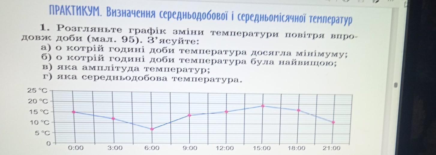 1. Розгляньте графік зміни температури повітря впро- довж доби (мал. 95). З’ясуйте: a) о котрій годині доби температура досягла мінімуму; б) о котрій годині доби температура була найвищою; в) яка амплітуда температур; г) яка середньодобова температура.