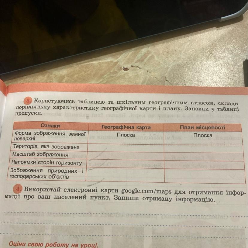 порівняльну характеристику географічної карти і плану. Заповни у таблиці