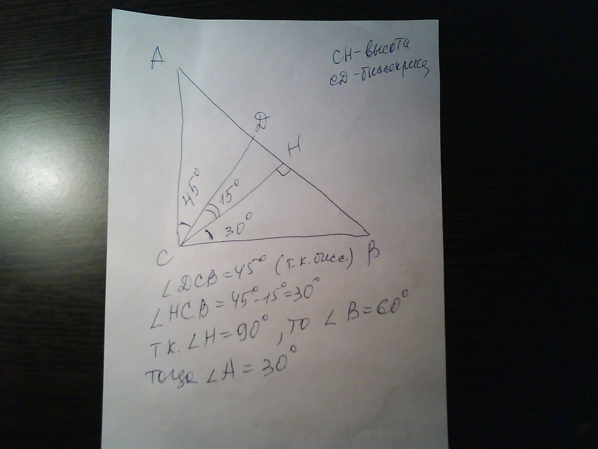 Найти углы прямоугольного треугольника, если угол между биссектрисой и высотой, проведенными из вершины прямого угла, равен 15 градусам.