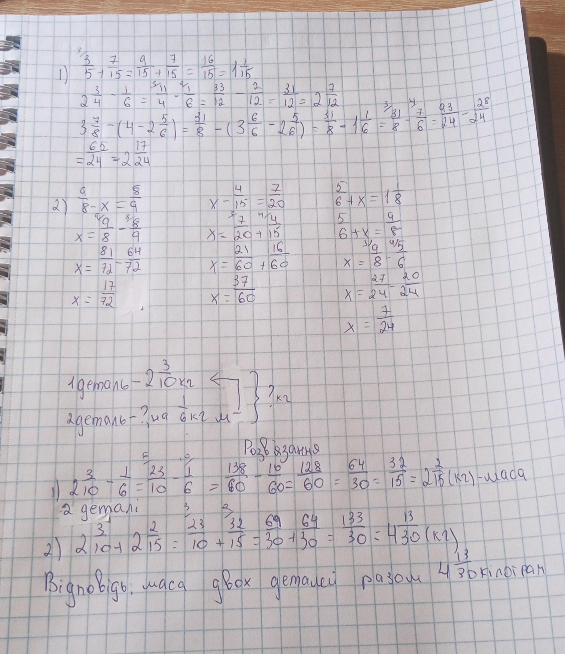 В задаче там вторая делать НА 1/6 меньше. НА, значит + или - в зависимости от условия (больше/меньше). Вторая делать НА 1/6 МЕНЬШЕ чем первая. Значит: первая деталь-1/6 = вторая деталь. Ну и сумма всех деталей - это сложить первую и вторую детальки