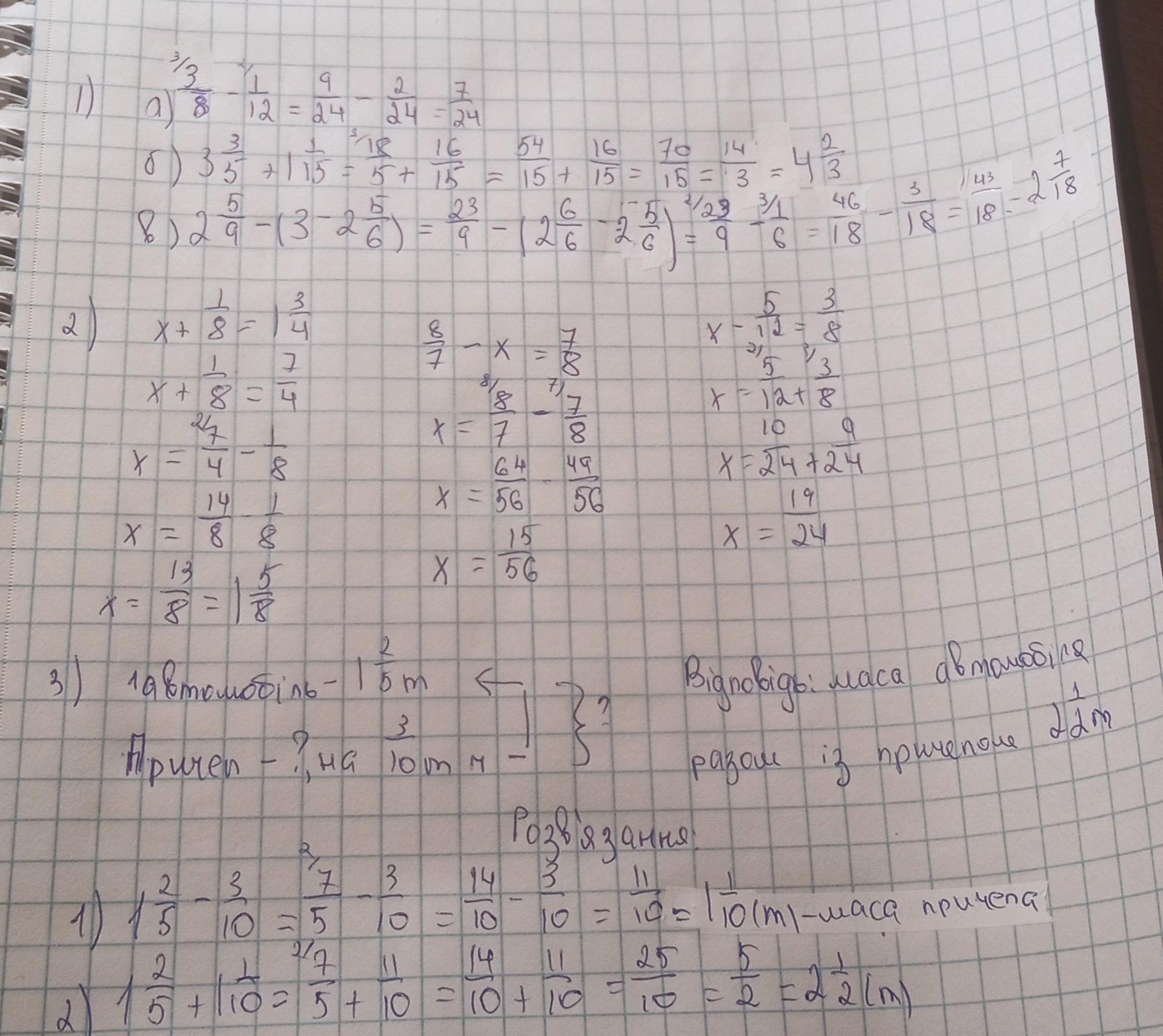 Чтобы решить примеры, нужно находить общий знаменатель. То число на которое делится и первый и второй знаменатель. Если у тебя смешанная дробь, то ее нужно переводить в неправильную(умножить целую часть(большую цифру) на знаменатель и прибавить числитель) и уже решать как обычно. Складывать/отнимать числители, и писать общий знаменатель. Дальше уже если нужно или сокращаем, или если неправильная дробь пишем ее в смешанном виде. Если там целое число минус дробь какая-то, например 3-2 5/6, ты 3 можешь представить как 2 6/6 (так как 6/6= 1(потому что если писать без дроби, то будет 6:6=1). Вообще целое число значит сколько вот таких вот дробей (5/5, 6/6, 7/7и тд.) В числе)