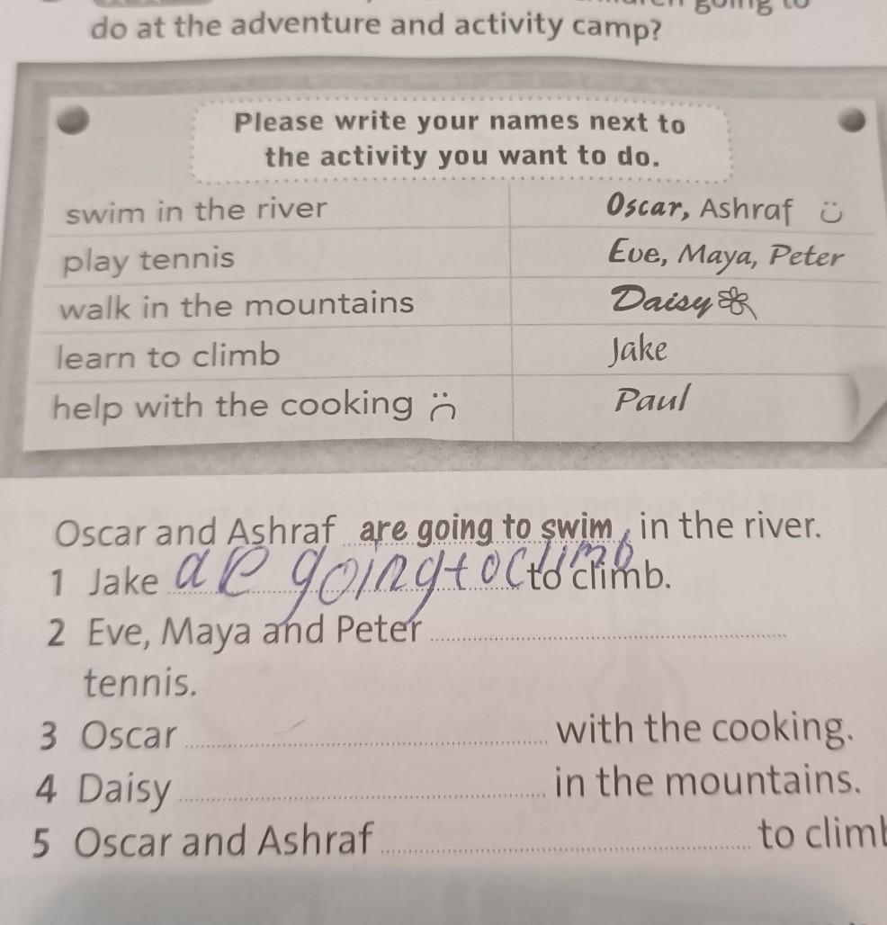 Is day. 3 What are / aren't these children going to do at the adventure and activity camp? Please write your names next to the activity you want to do. swim in the river play tennis walk in the mountains learn to climb help with the cooking Oscar, Ashraf ü Eve, Maya, Peter Daisy & Jake 3 Oscar 4 Daisy 5 Oscar and Ashraf Paul Oscar and Ashraf are going to swim in the river. climb. 1 Jake a be going to ch 2 Eve, Maya and Peter tennis. with the cooking. in the mountains. to climb.