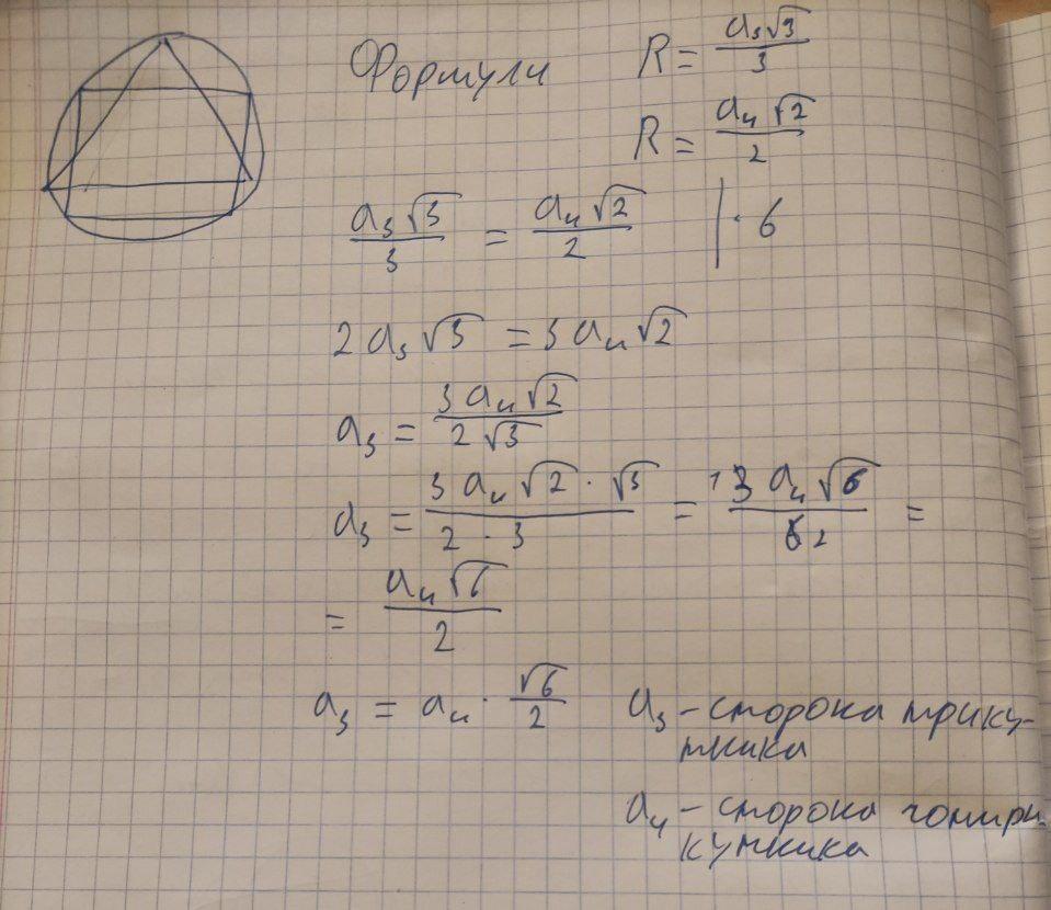 Знайти відношення сторони правильного трикутника, вписаного в коло, до сторони правильного чотирикутника, вписаного в це коло.